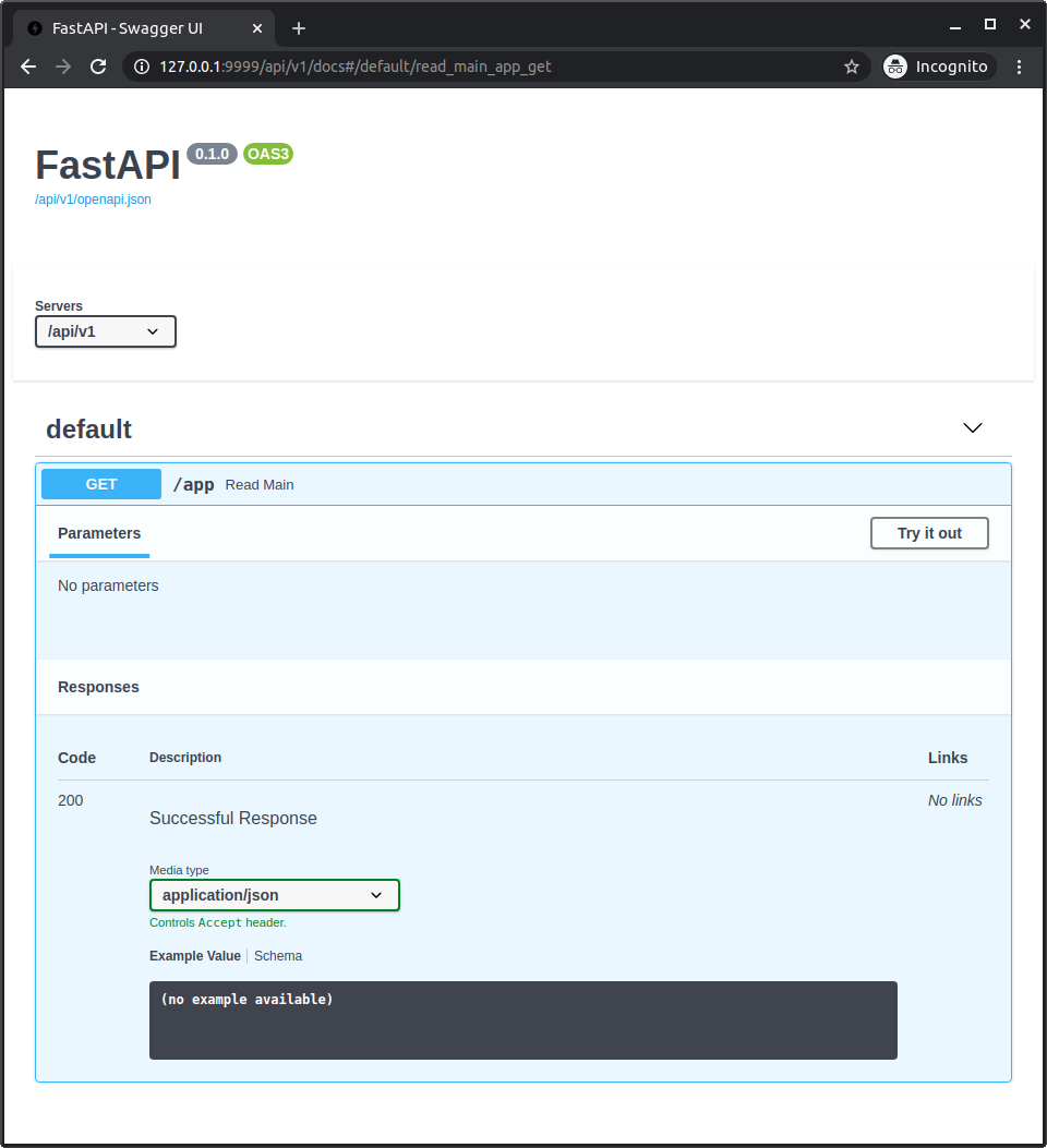 Perceba que, mesmo acessando em http://127.0.0.1:8000/app, ele mostra o root_path de /api/v1, retirado da opção --root-path.