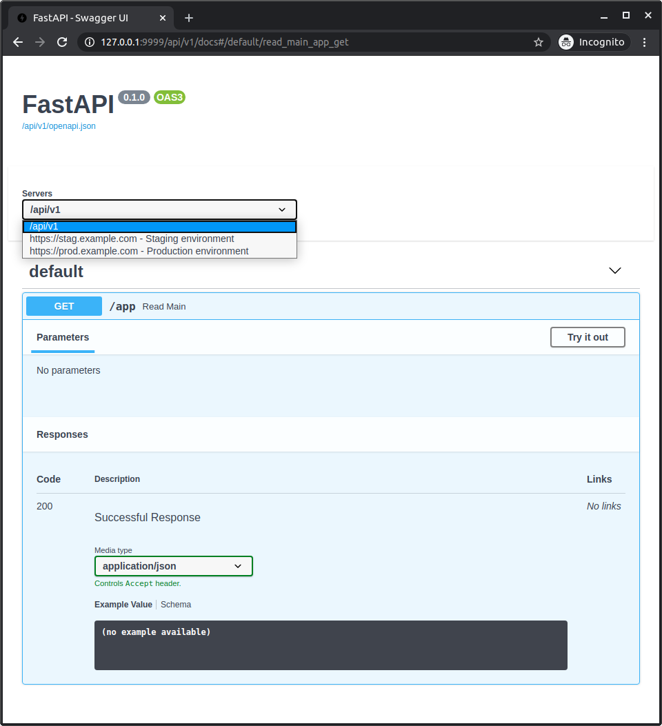 Perceba o servidor gerado automaticamente com um valor url de /api/v1, retirado do root_path.