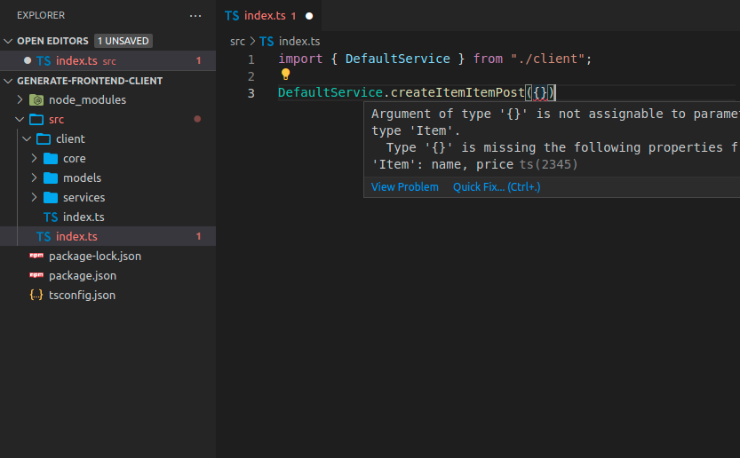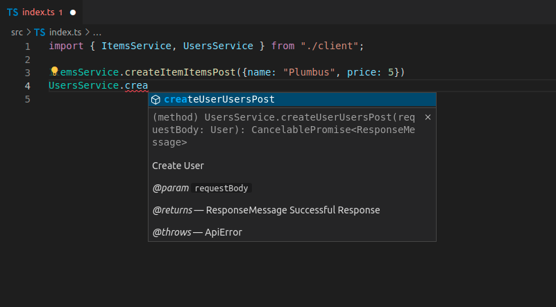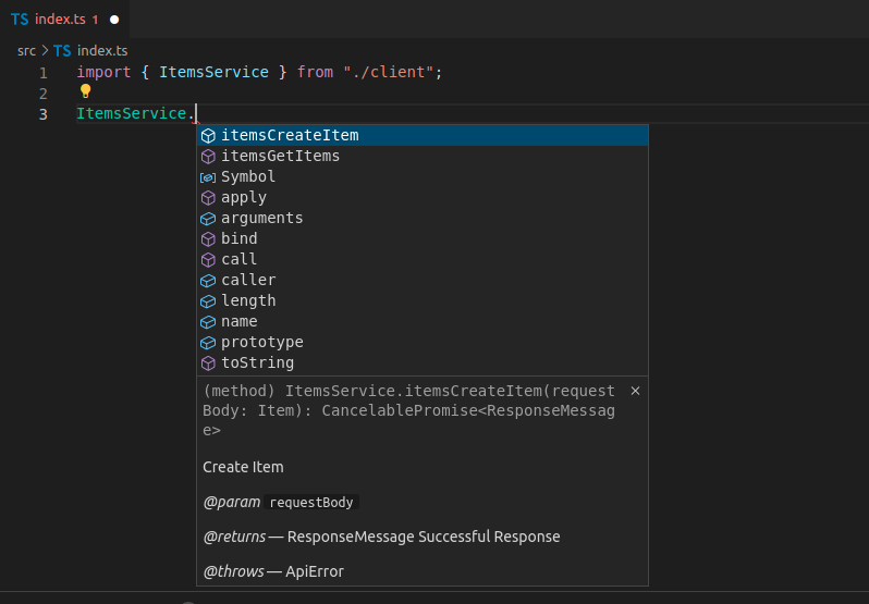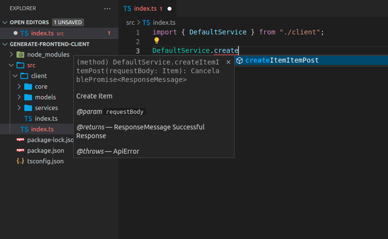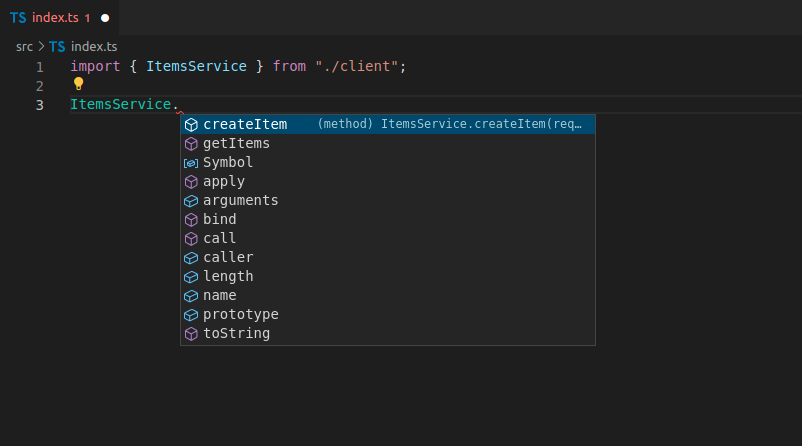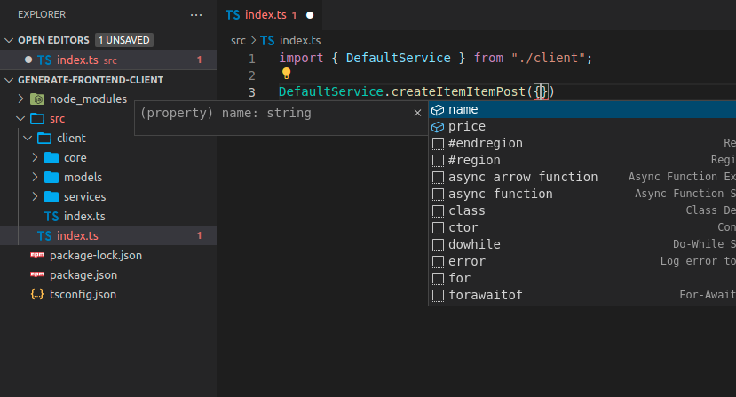 Agora você pode importar e usar o código do cliente. Poderia ser assim, observe que você obtém preenchimento automático para os métodos: