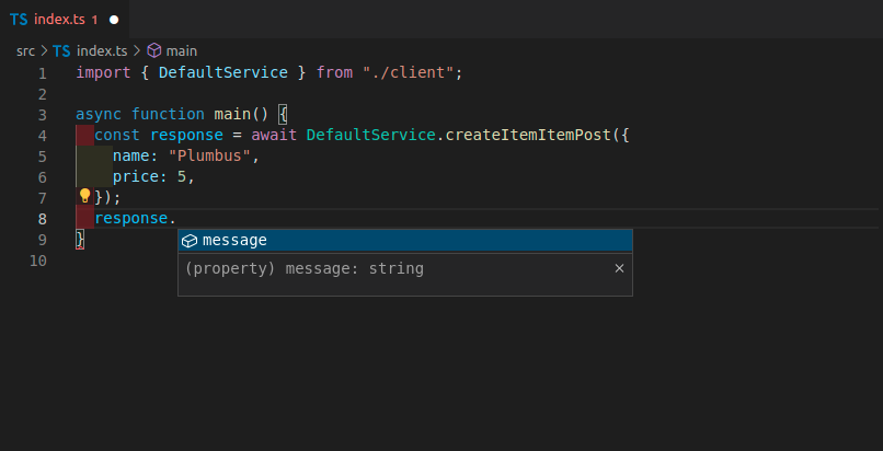 Depois de gerar o novo cliente, você terá agora nomes de métodos “limpos”, com todo o preenchimento automático, erros em linha, etc: