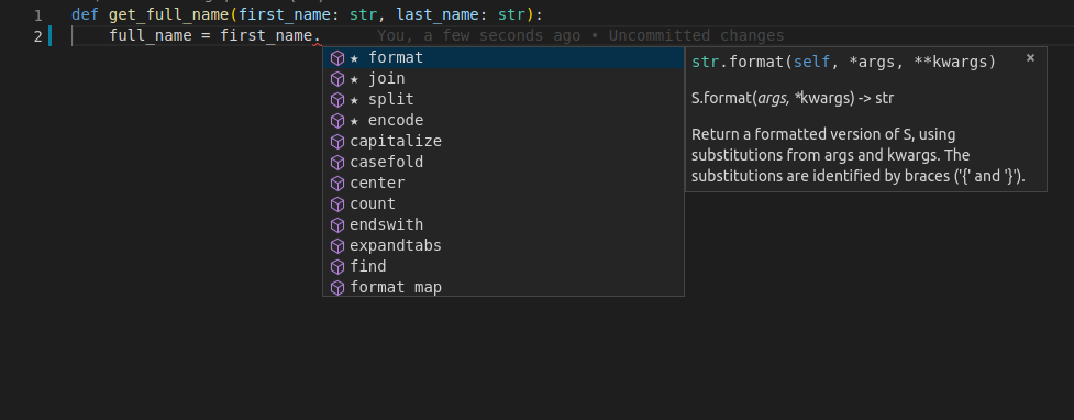 Você digita o primeiro parâmetro da função, first_name, depois um ponto (.) e, em seguida, pressiona Ctrl + Space para acionar a conclusão.